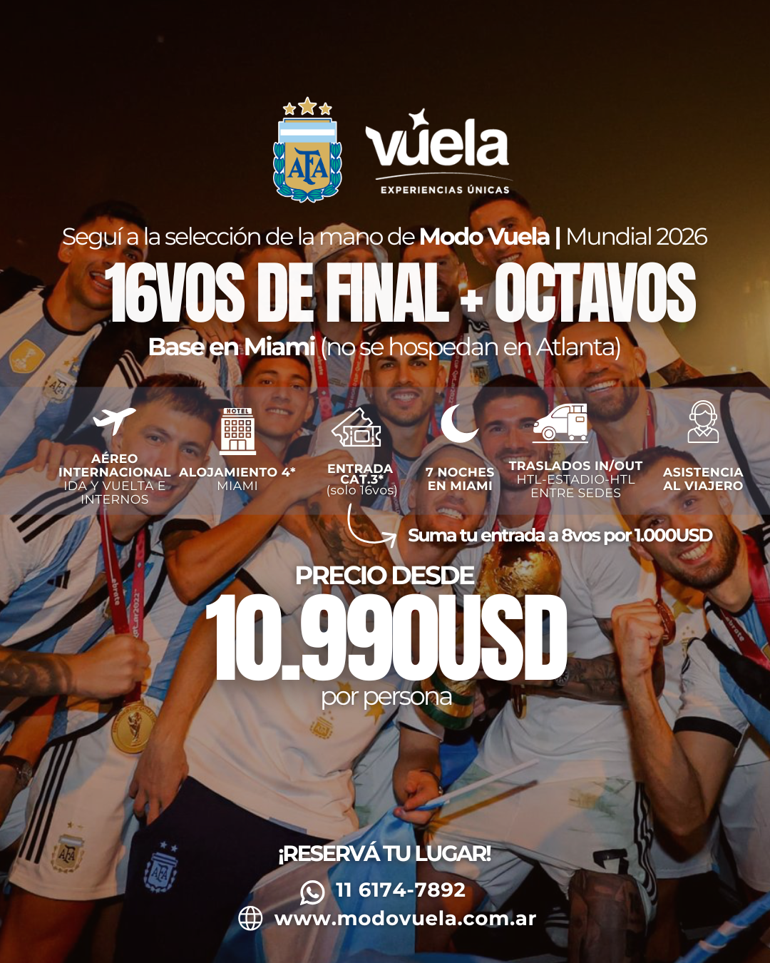 • 🎟️ Entrada categoría 3 (sólo al partido de 16vos. Si quisieras sumar tu entrada para 8vos, podes hacerlo por 1.000 USD extras).